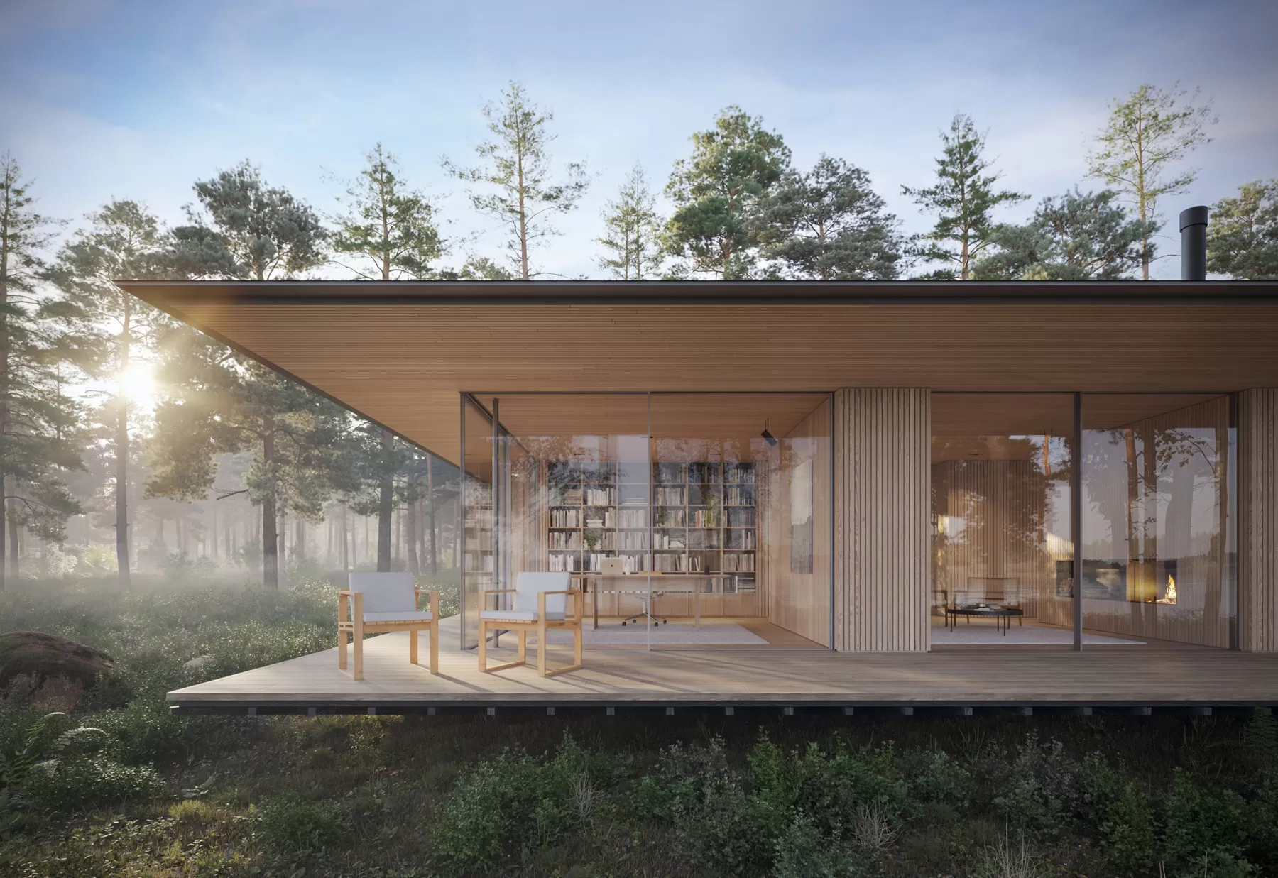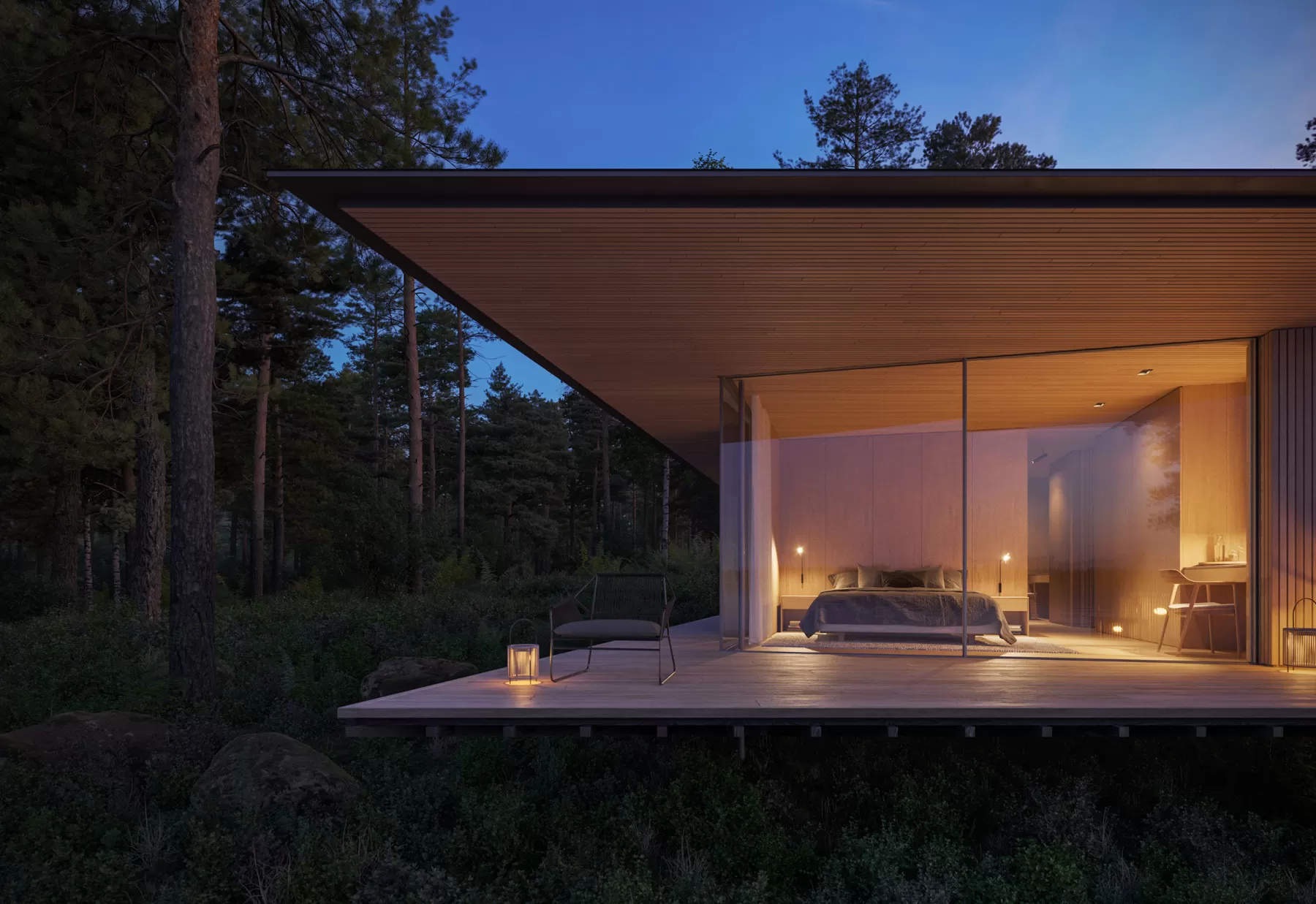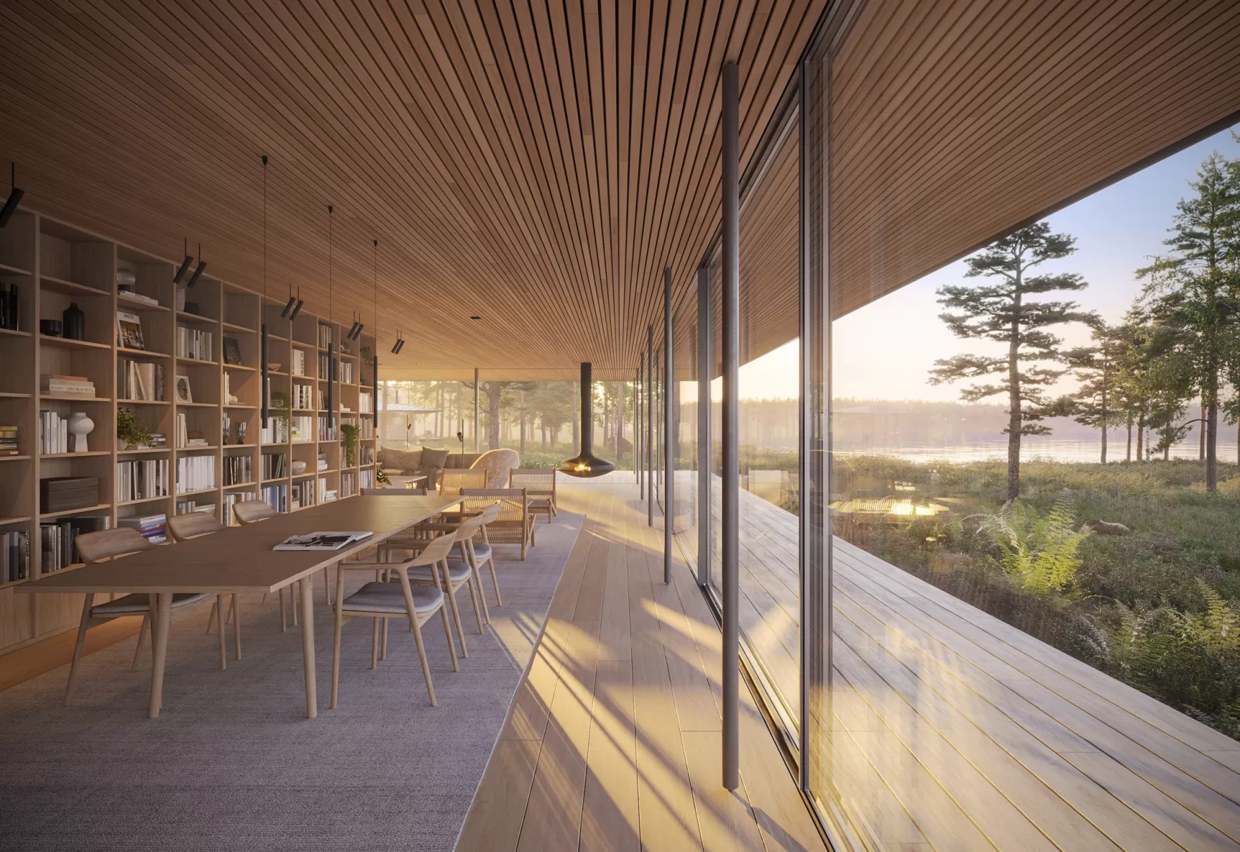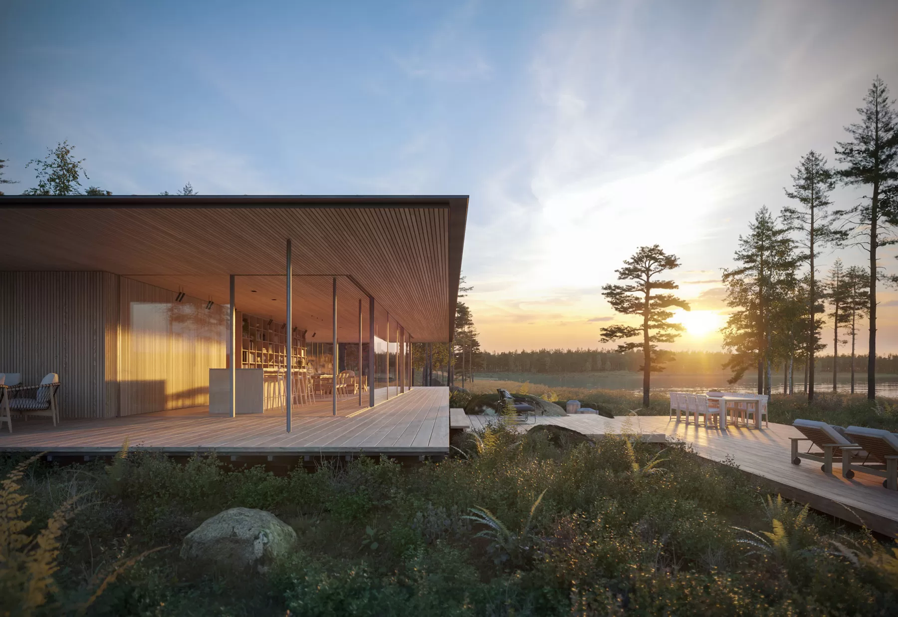 These pavilions are designed to blend harmoniously with the untouched Finnish landscape, appearing to float lightly within their natural surroundings. The site itself remains pristine, allowing the buildings to feel integrated and at peace with their environment.