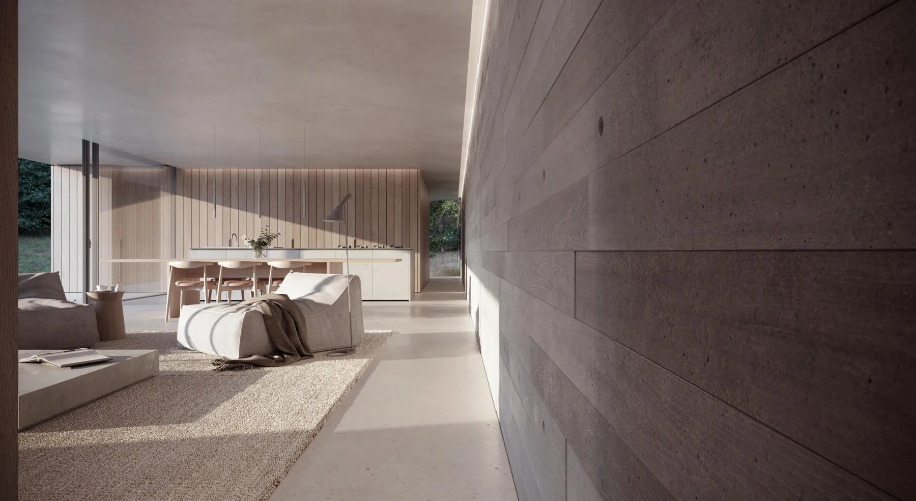 The house is to be built out of concrete with concrete floor, ceiling and the large rear wall is in board-marked concrete.