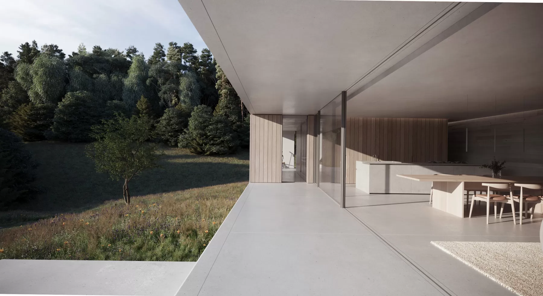 Bedroom accommodation is at either end of the house, contained in two timber-clad volumes. The timber wraps from outside to inside to provide a uniform appearance.