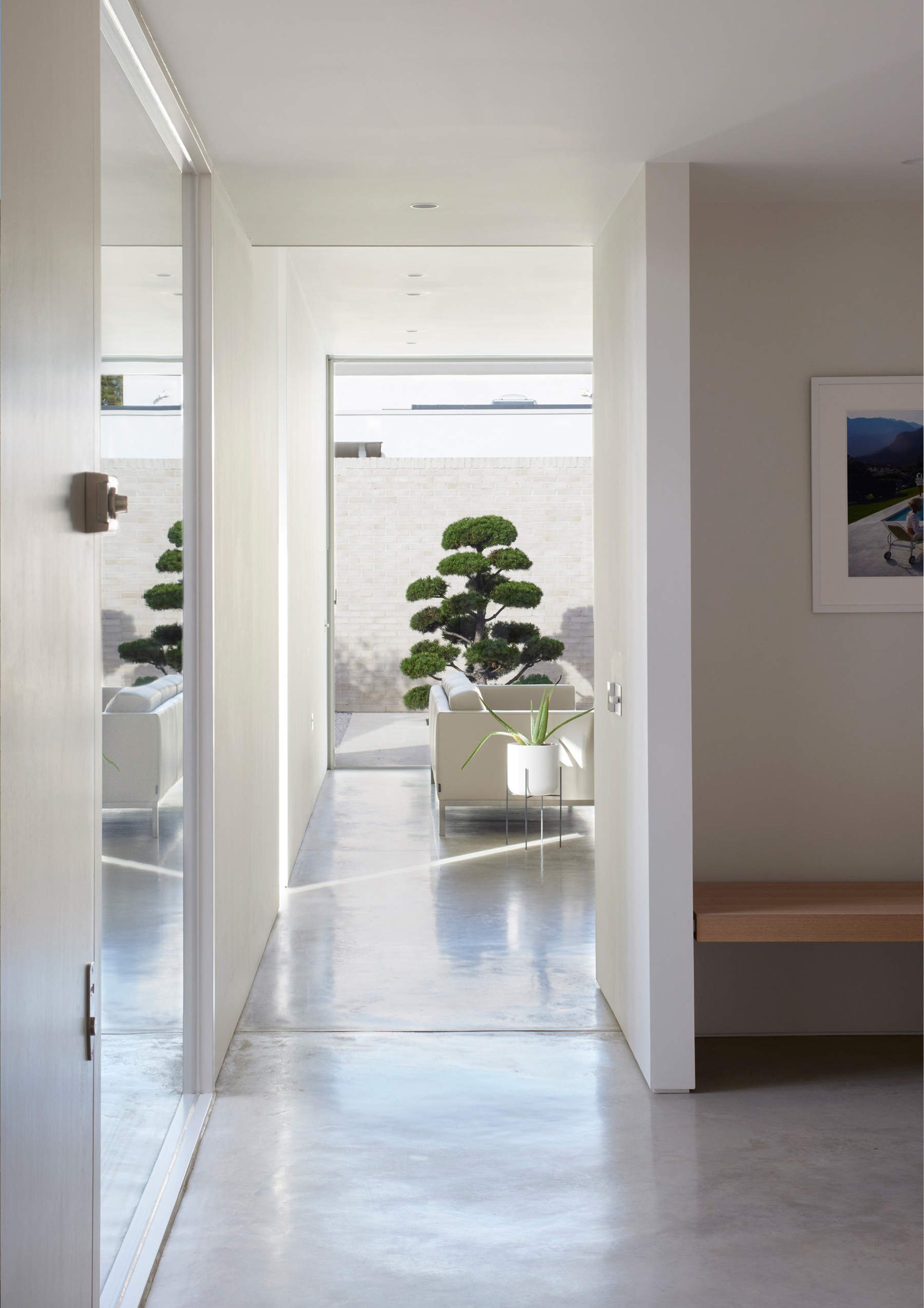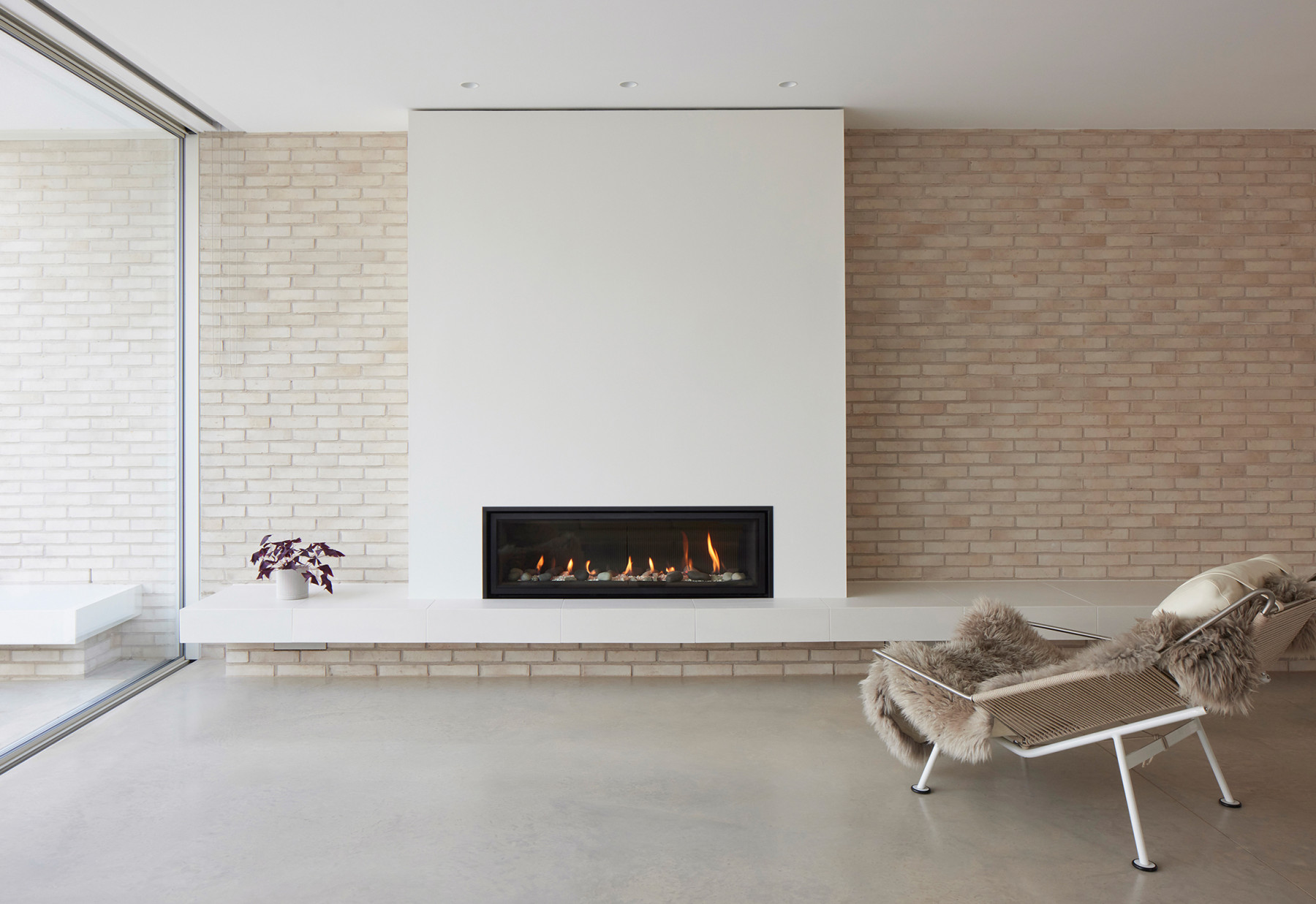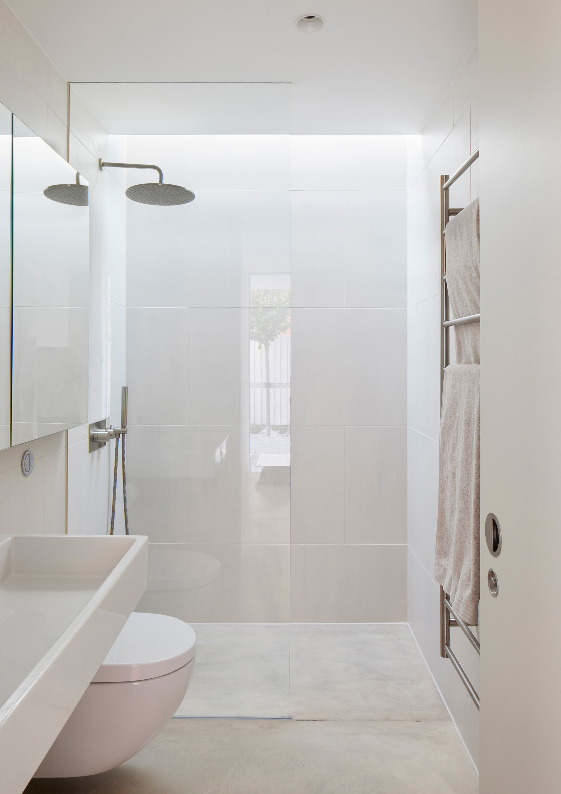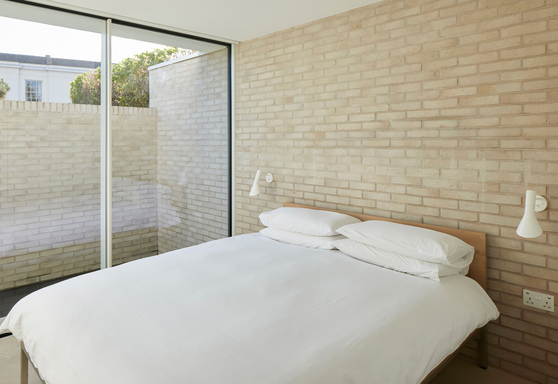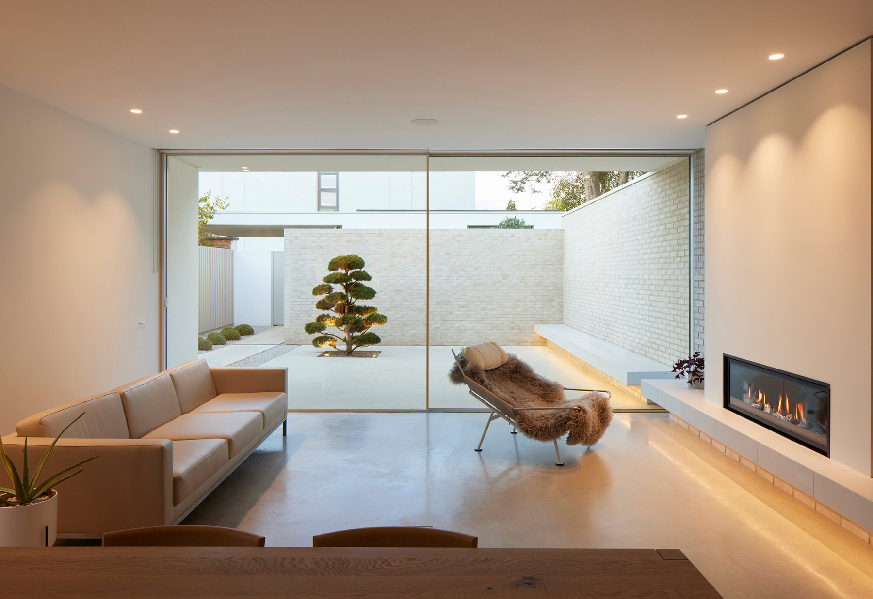 The material palette is minimal, and to complement the white bricks, there is white render and a polished concrete floor that runs from inside to outside.