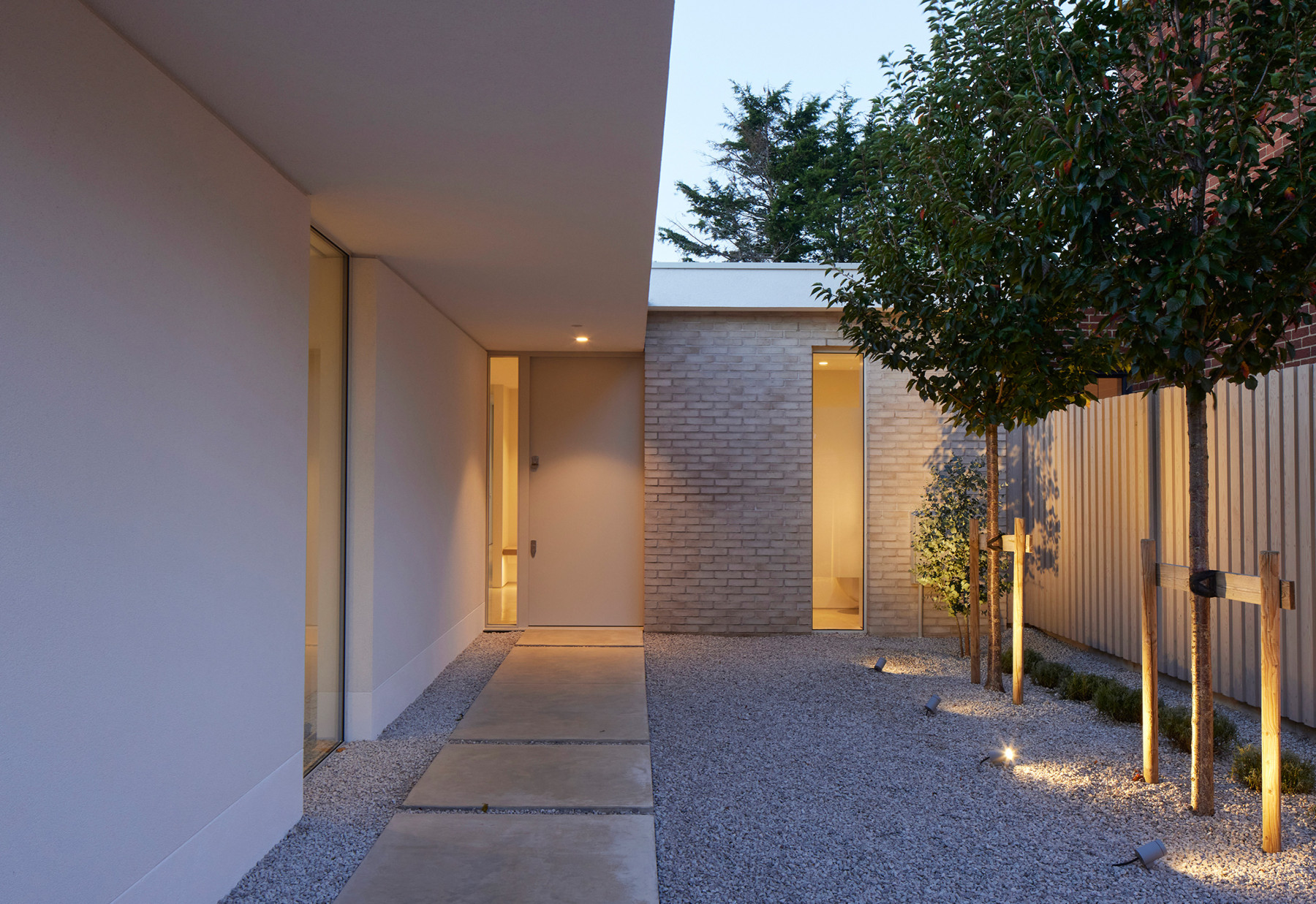 The narrow urban plot faces a busy road edged by a solid brick wall. We designed the house to sit low, with just a discreet roof plane peeking above the wall, so it has minimal impact on the surroundings. A gate provides access off the street, and set further in is a white brick wall, creating another layer of protection to the road. From here, polished concrete stepping stones lead into a more private gravelled courtyard garden and the entrance.