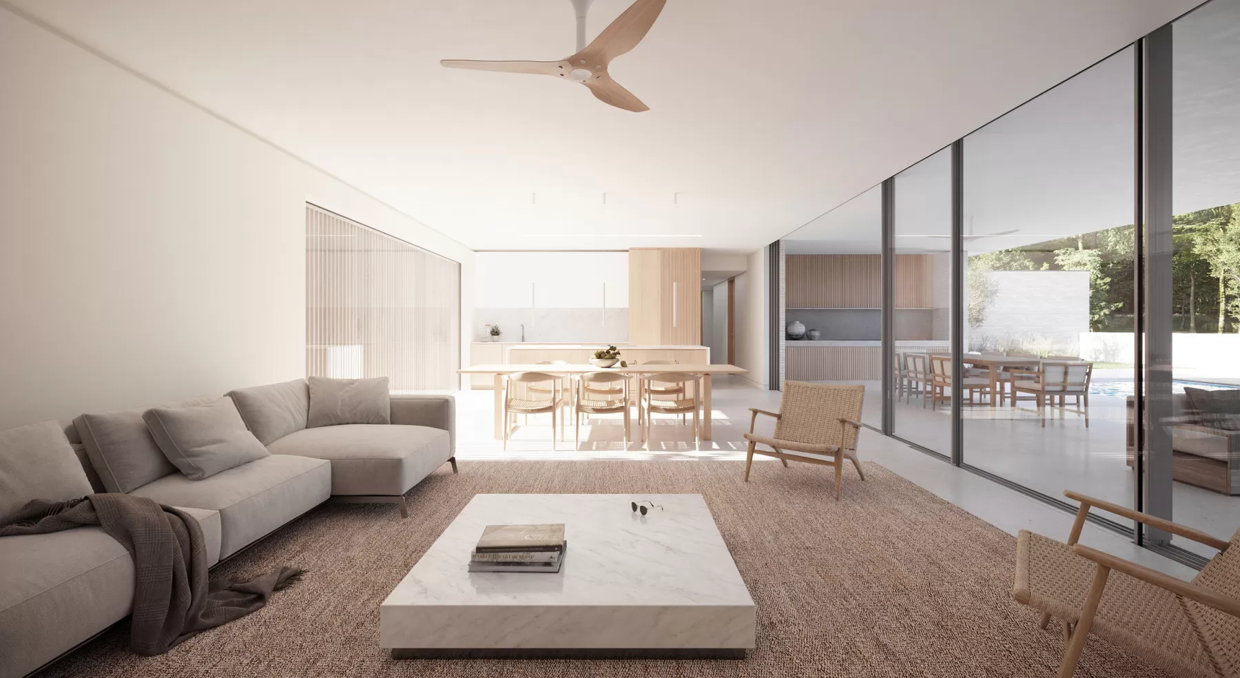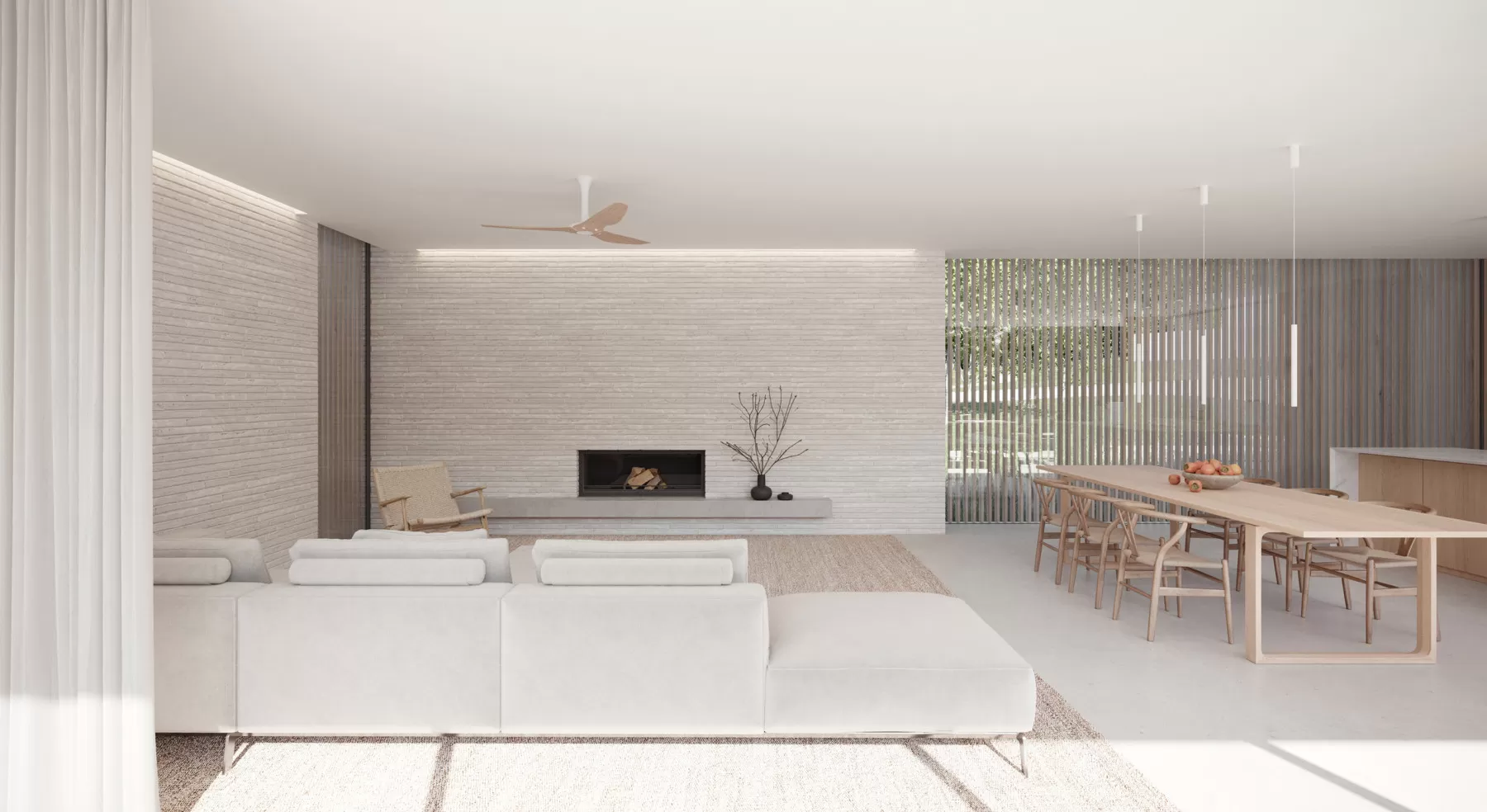 In the long house, all the rooms are orientated towards the internal courtyard with its open side facing the forest. The accommodation comprises 3 en-suite bedrooms, guest WC, plant/ utility, and a large open plan living space. A large overhang provides shading and covered outdoor living. A courtyard with restrained landscaping also contains a pool with an infinity edge towards the forest.