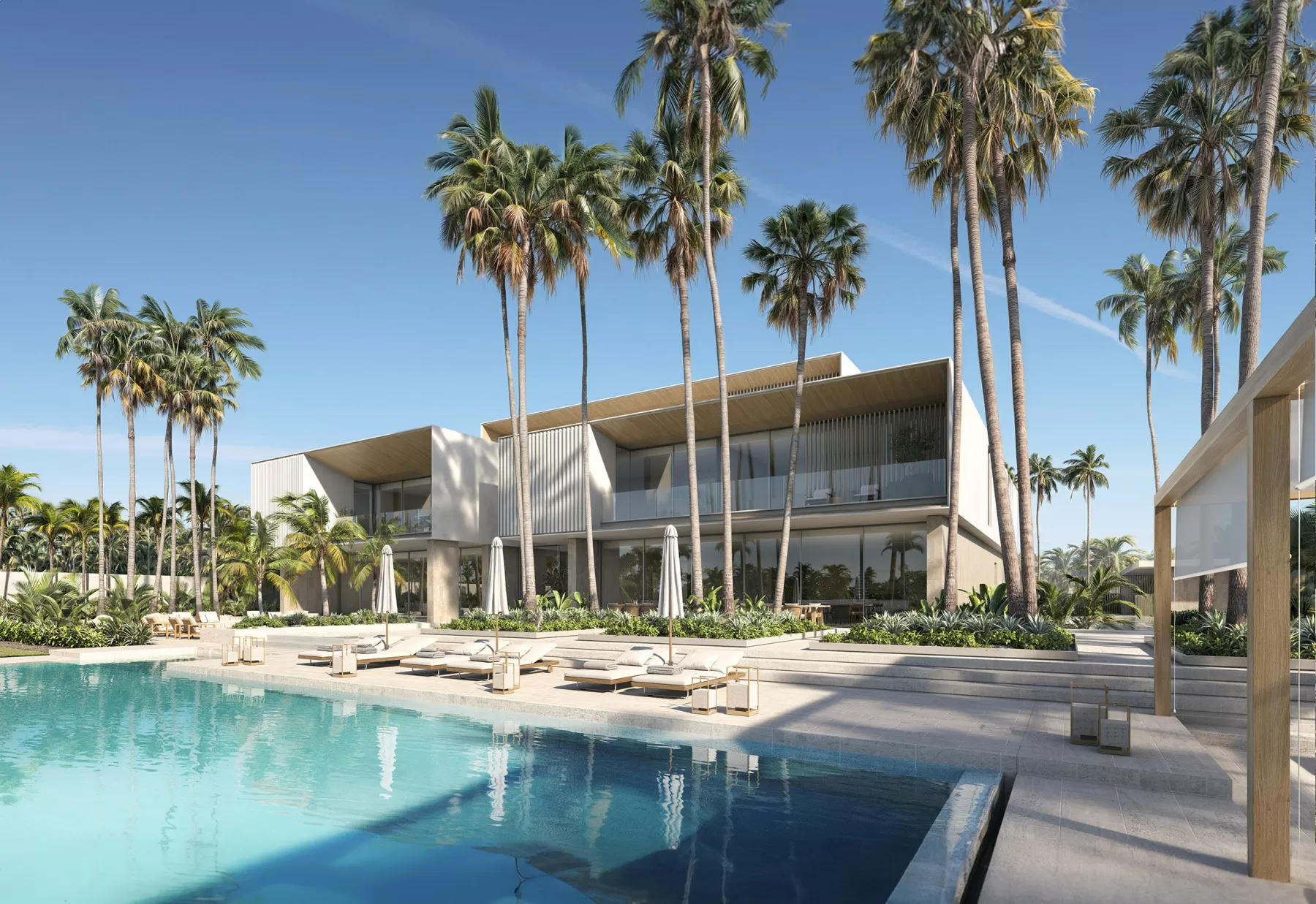The rear of the villas opens to expansive gardens with a blend of hard and soft landscaping. Multiple areas for dining, relaxation, and enjoyment of the 20-meter infinity pool are tailored for different weather conditions and times of day, offering versatile outdoor living experiences.